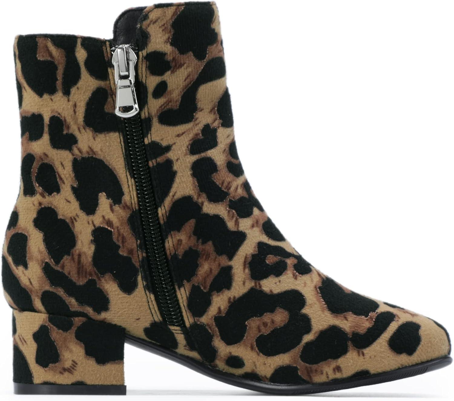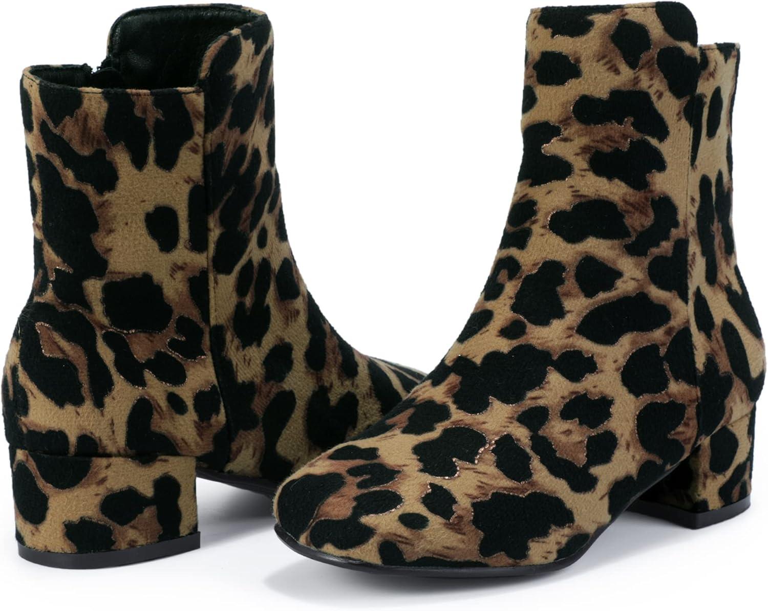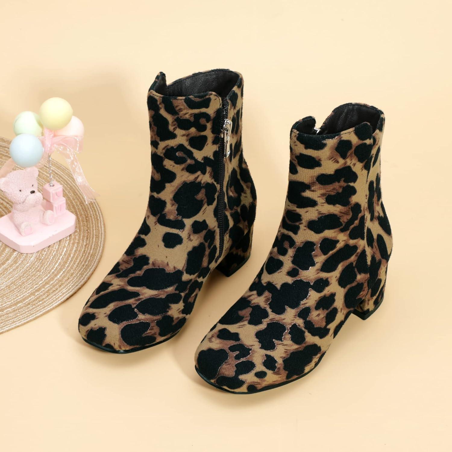 PANDANINJIA Girls Boots Fashion Square-Toe Dress Boots Low Heel Alyssa Ankle Booties with Zipper for Toddler Little Kids Big Kids(Leopard Suede)