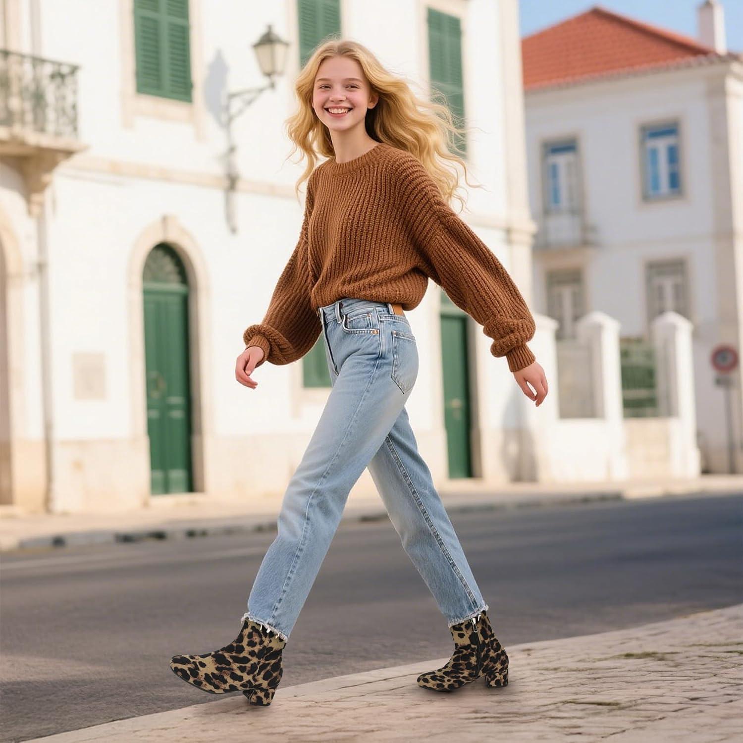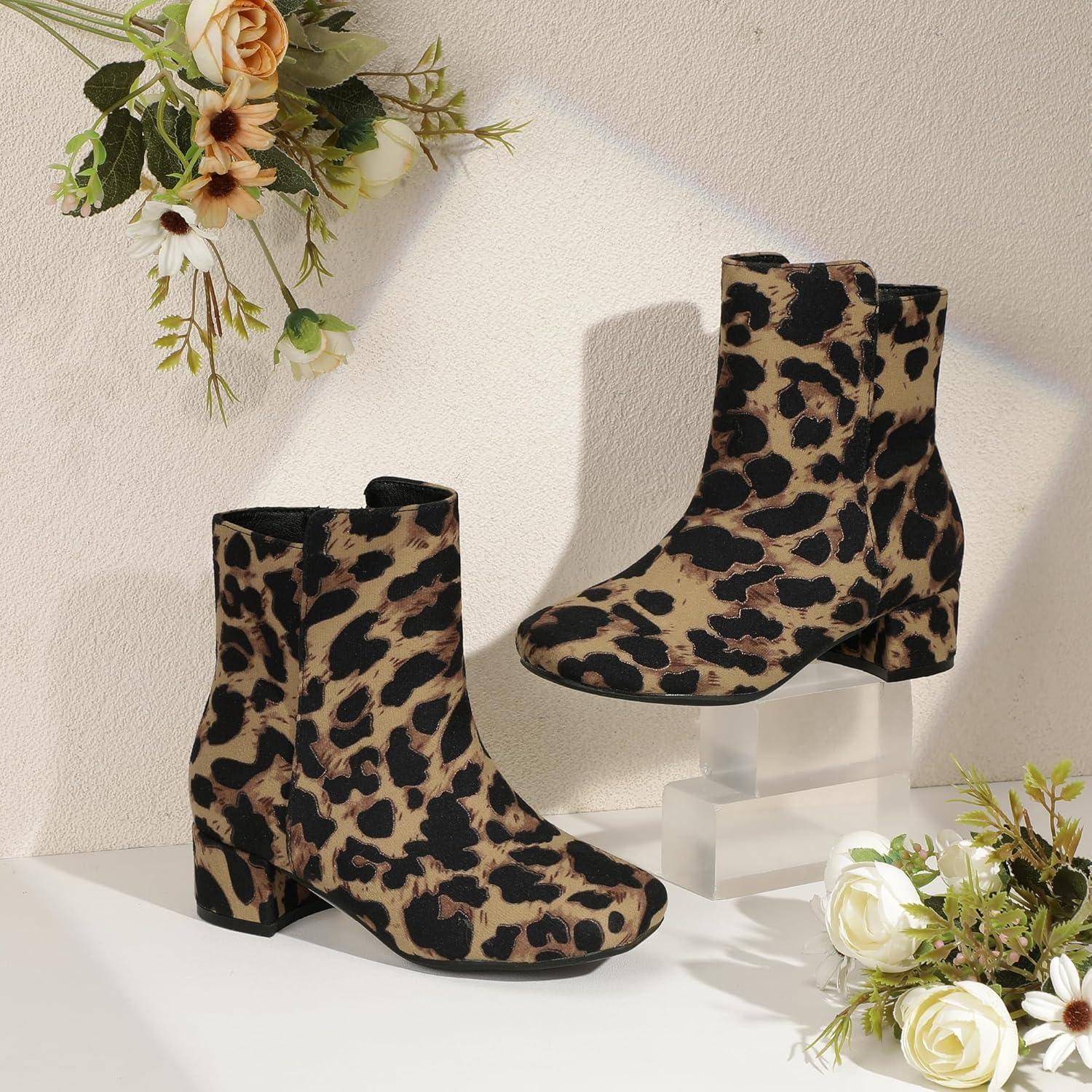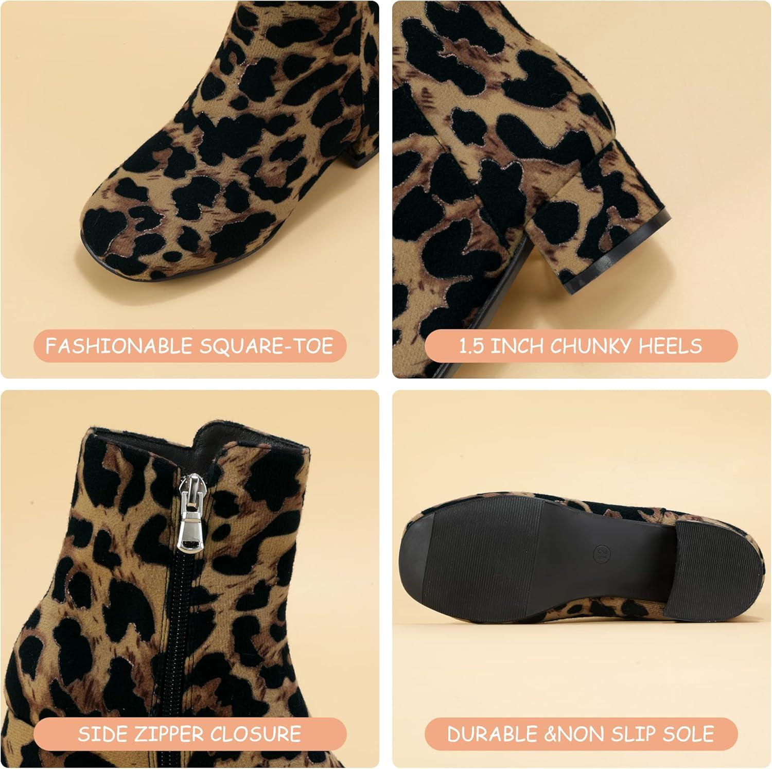 PANDANINJIA Girls Boots Fashion Square-Toe Dress Boots Low Heel Alyssa Ankle Booties with Zipper for Toddler Little Kids Big Kids(Leopard Suede)