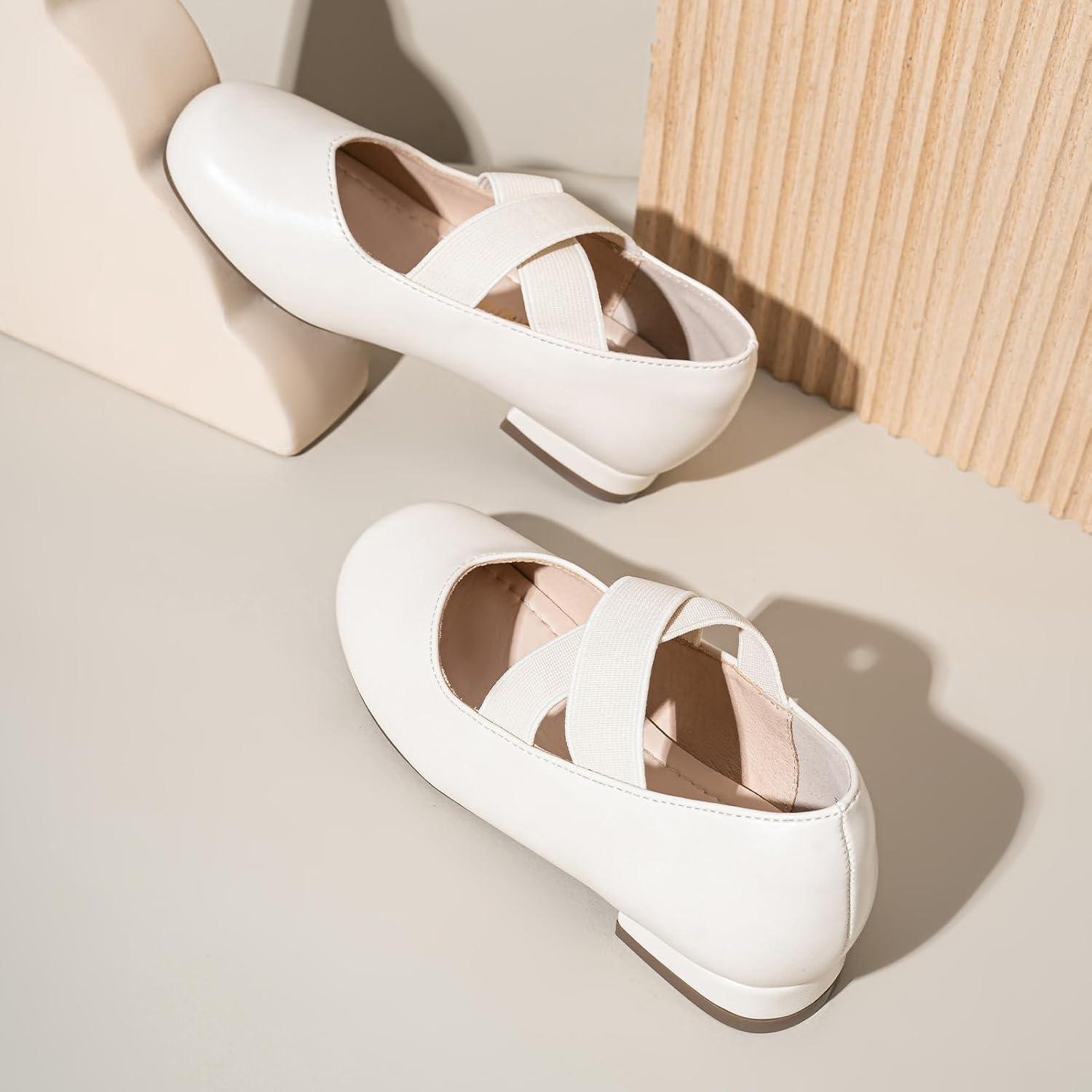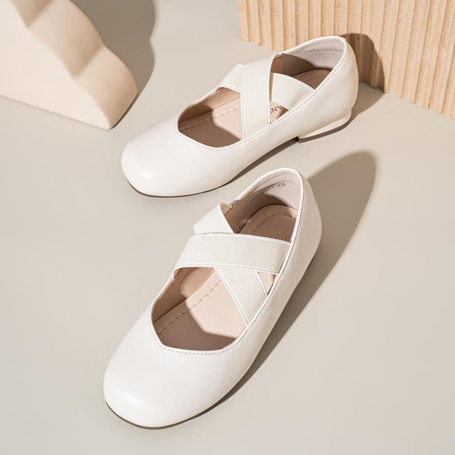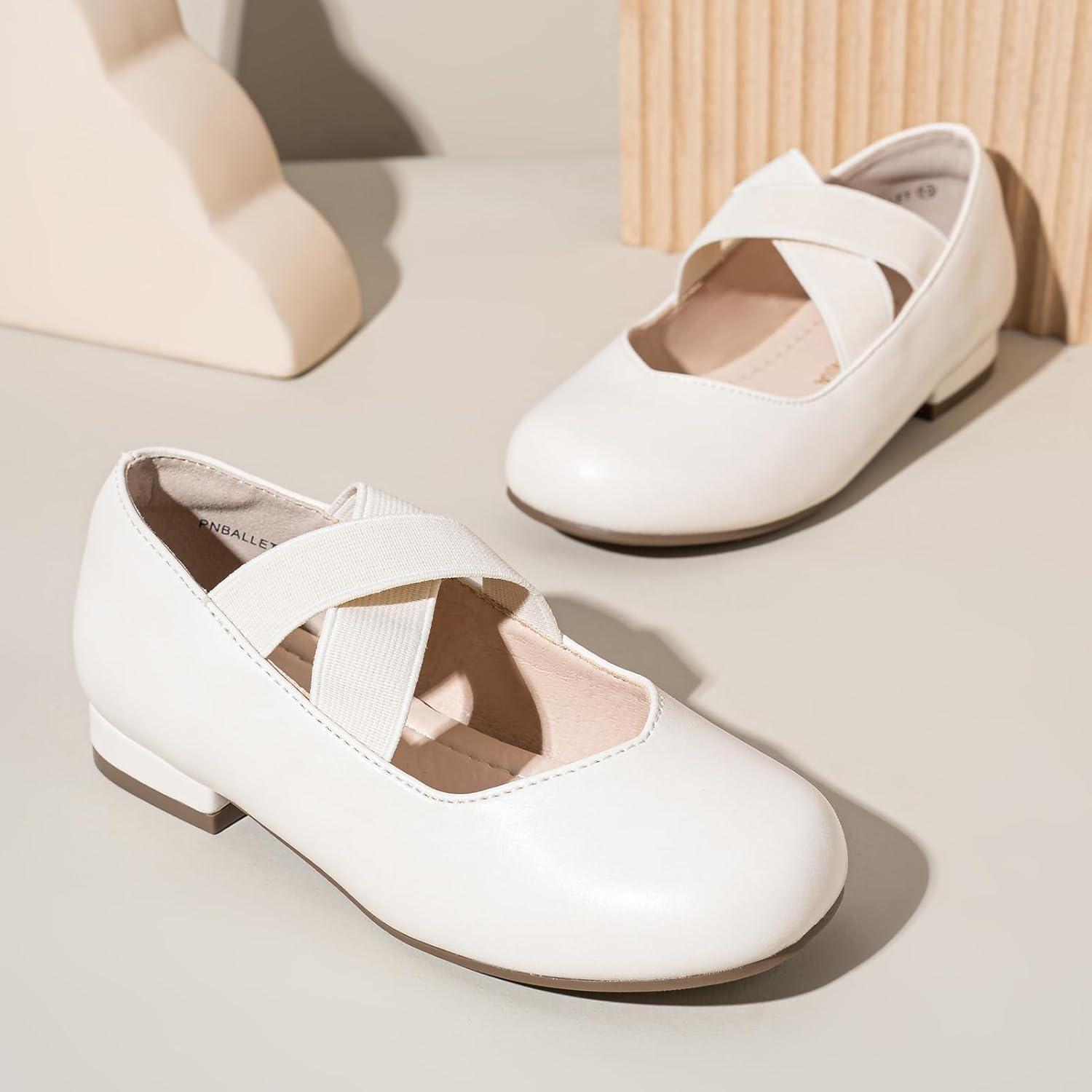 PANDANINJIA Girls Dress Shoes Ballet Flats Mary Jane Elastic Cross Strap Little Big Kid Low Heels Flower Girl Shoes(White)