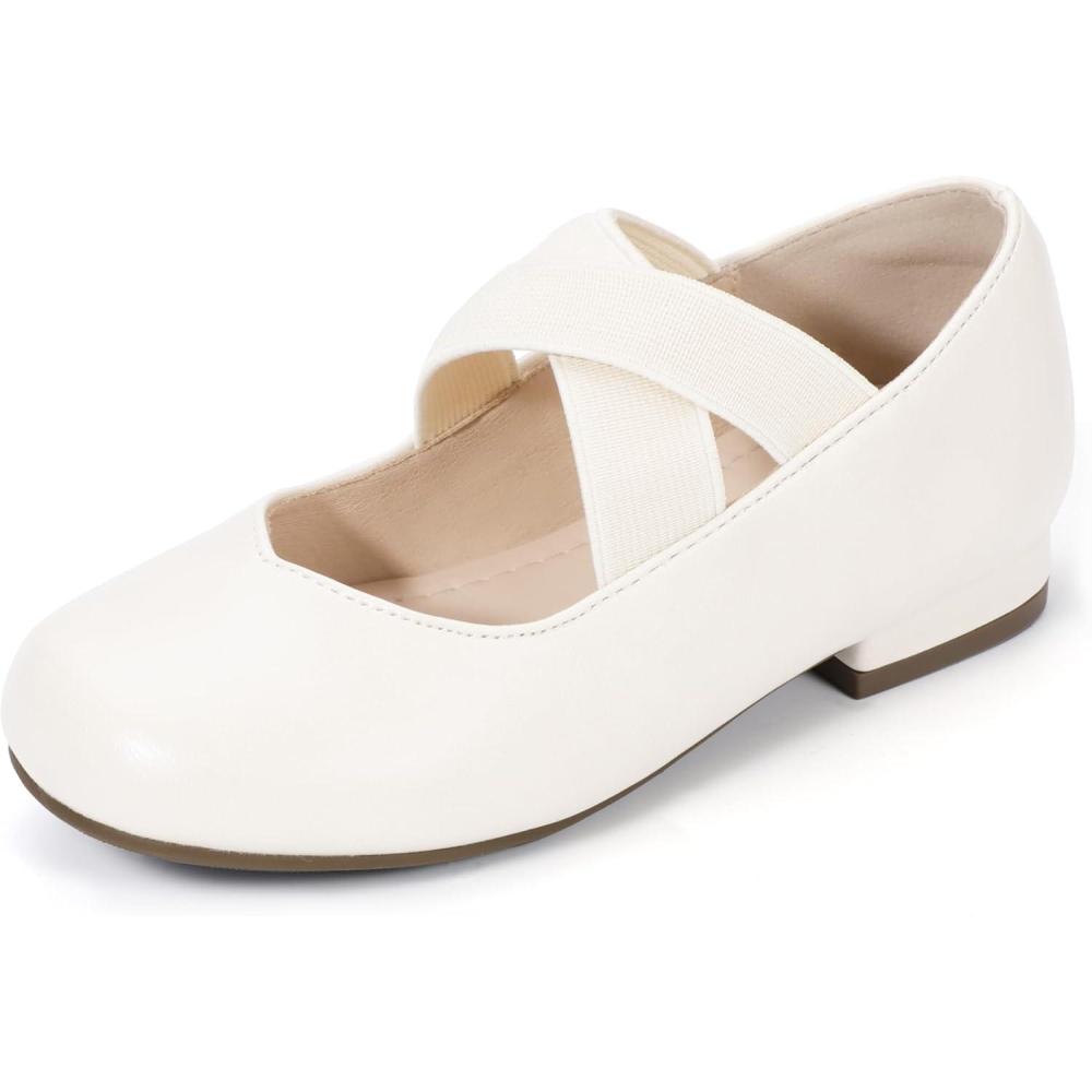 PANDANINJIA Girls Dress Shoes Ballet Flats Mary Jane Elastic Cross Strap Little Big Kid Low Heels Flower Girl Shoes(Ivory)