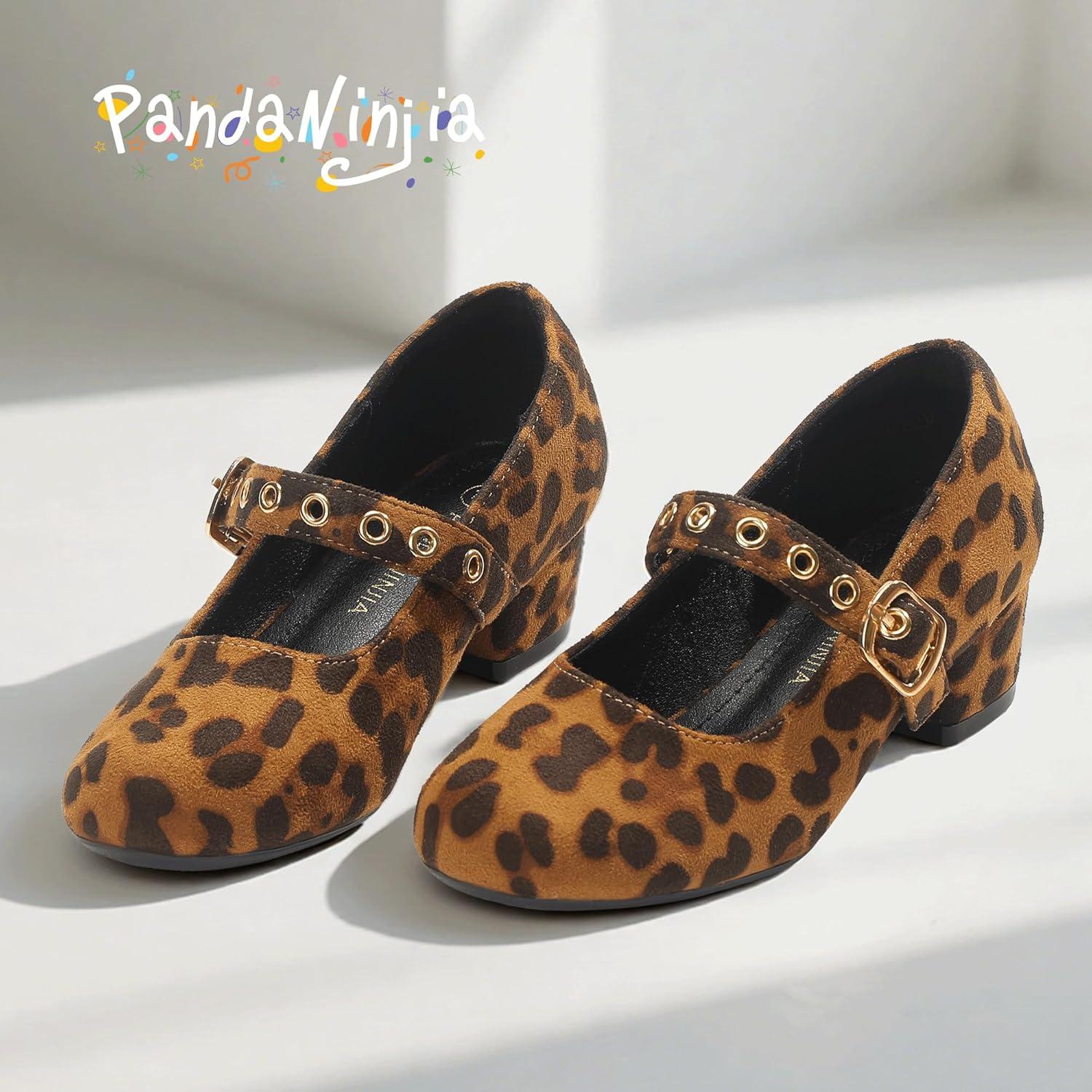 PANDANINJIA Girls Dress Shoes Little Big Kids Mary Jane Low Heels Buckle Round Toe Flower Girl Wedding Church Party School Pump Shoes(Leopard Suede)