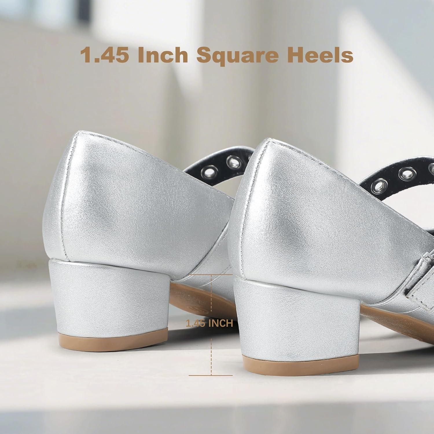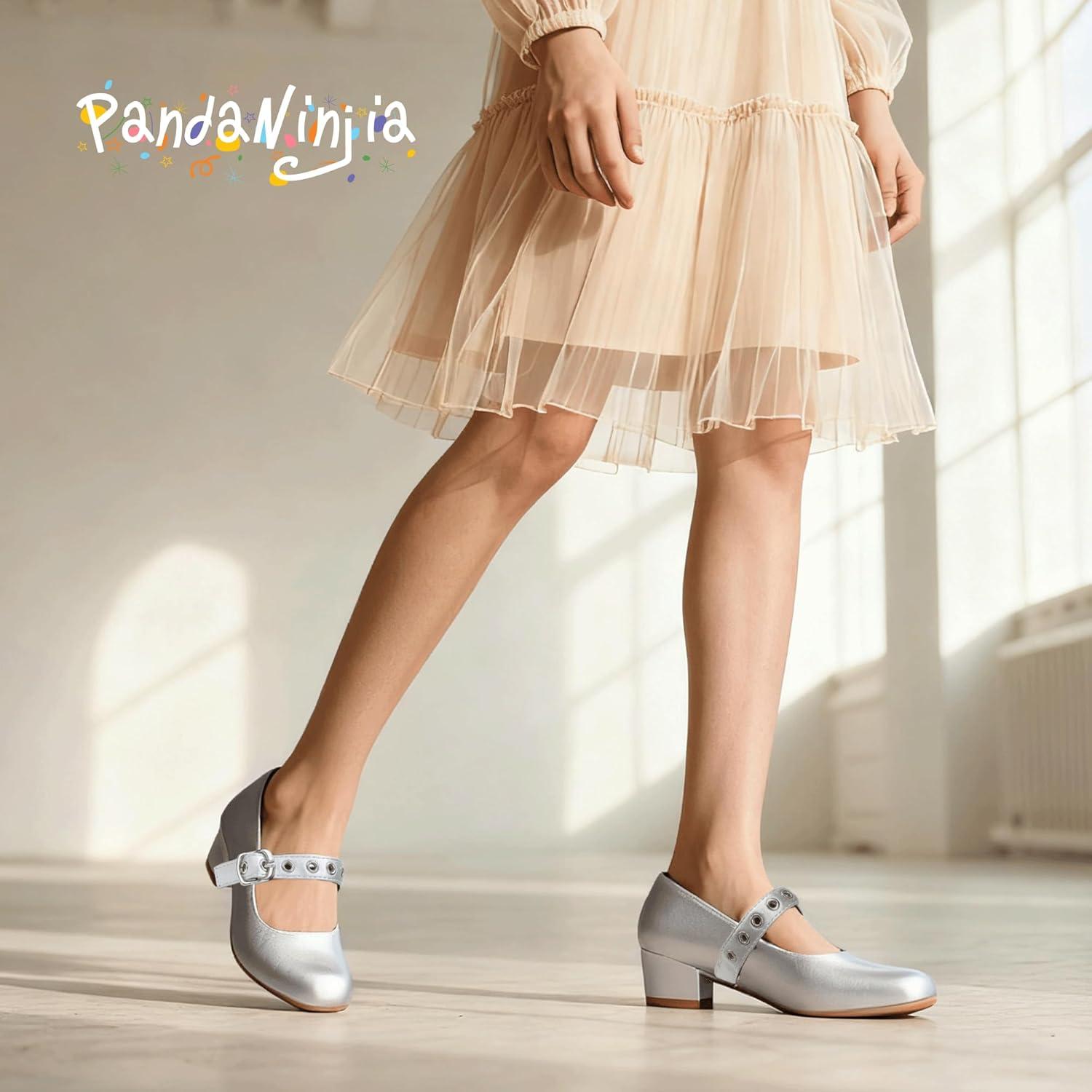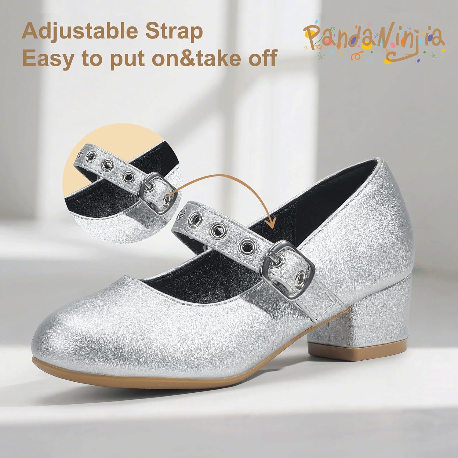 PANDANINJIA Girls Dress Shoes Little Big Kids Mary Jane Low Heels Buckle Round Toe Flower Girl Wedding Church Party School Pump Shoes(Silver Pu)