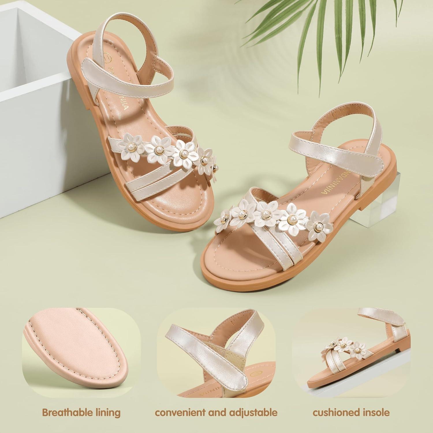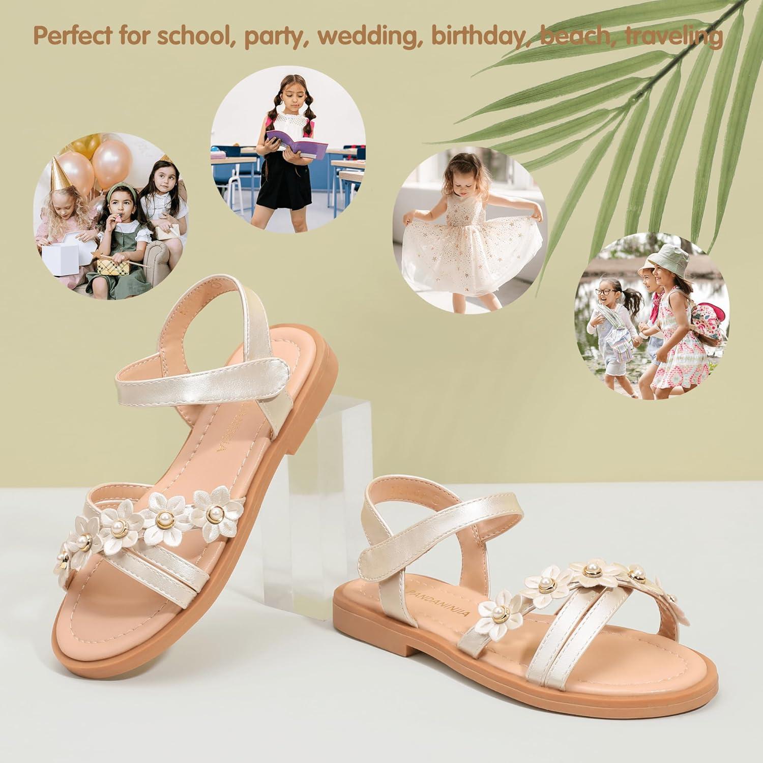 PANDANINJIA Girls Sandals Toddler Little Big Kids Kid Cute Open Toe Flats Dress Sandals Mona Summer Shoes(Champagne Pu M)