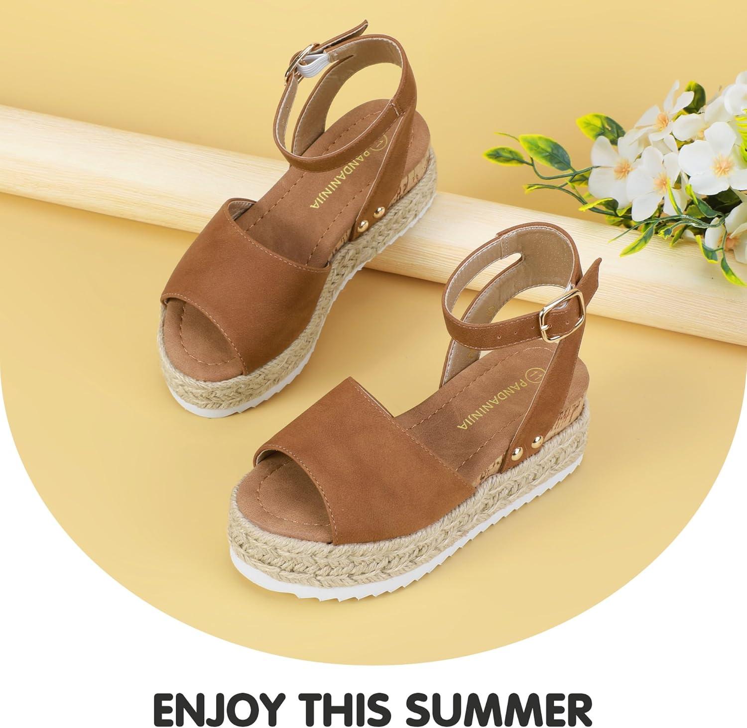 PANDANINJIA Girls Sandals Wedge Platform Espadrille Open Toe Summer Little Big Kid Flower Girl Heels Dress Shoes(Brown Nubuck)