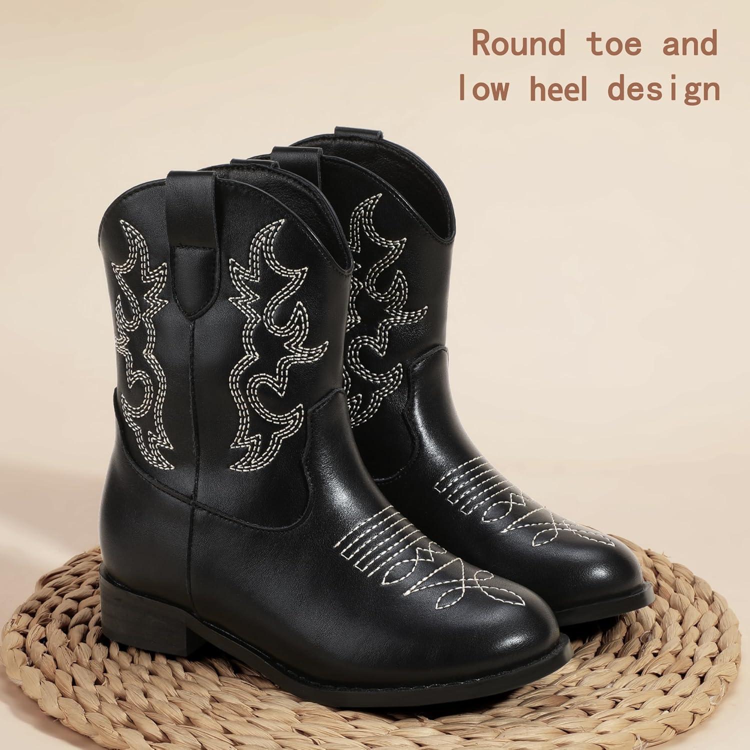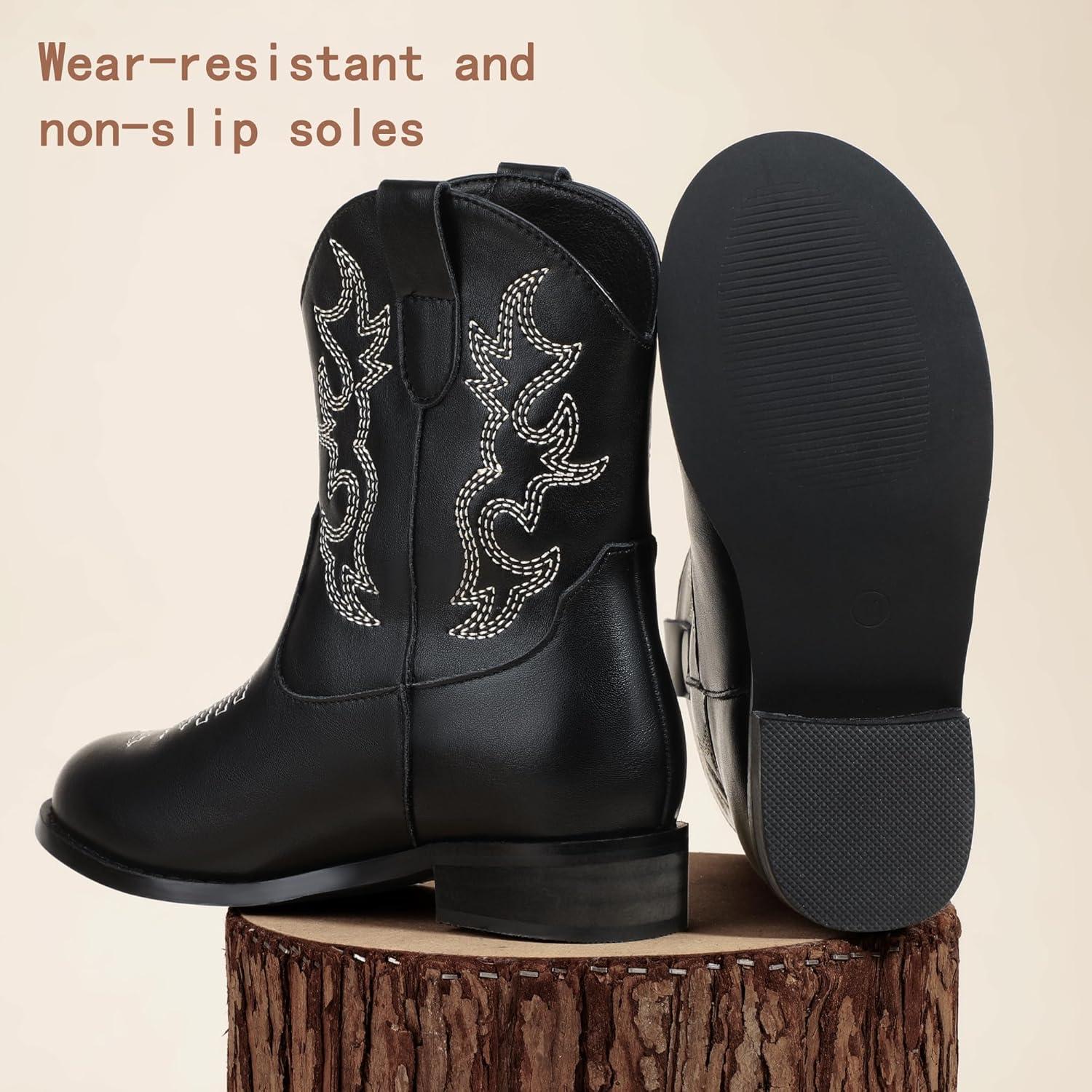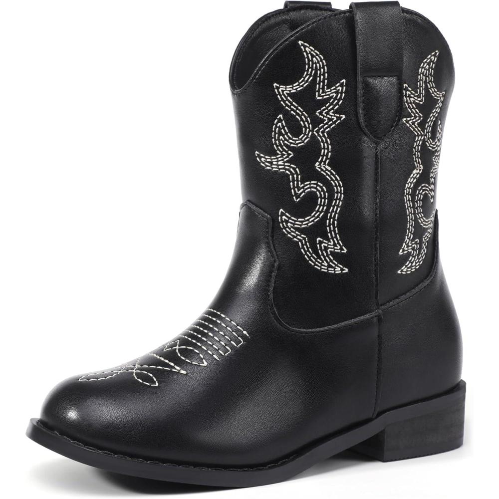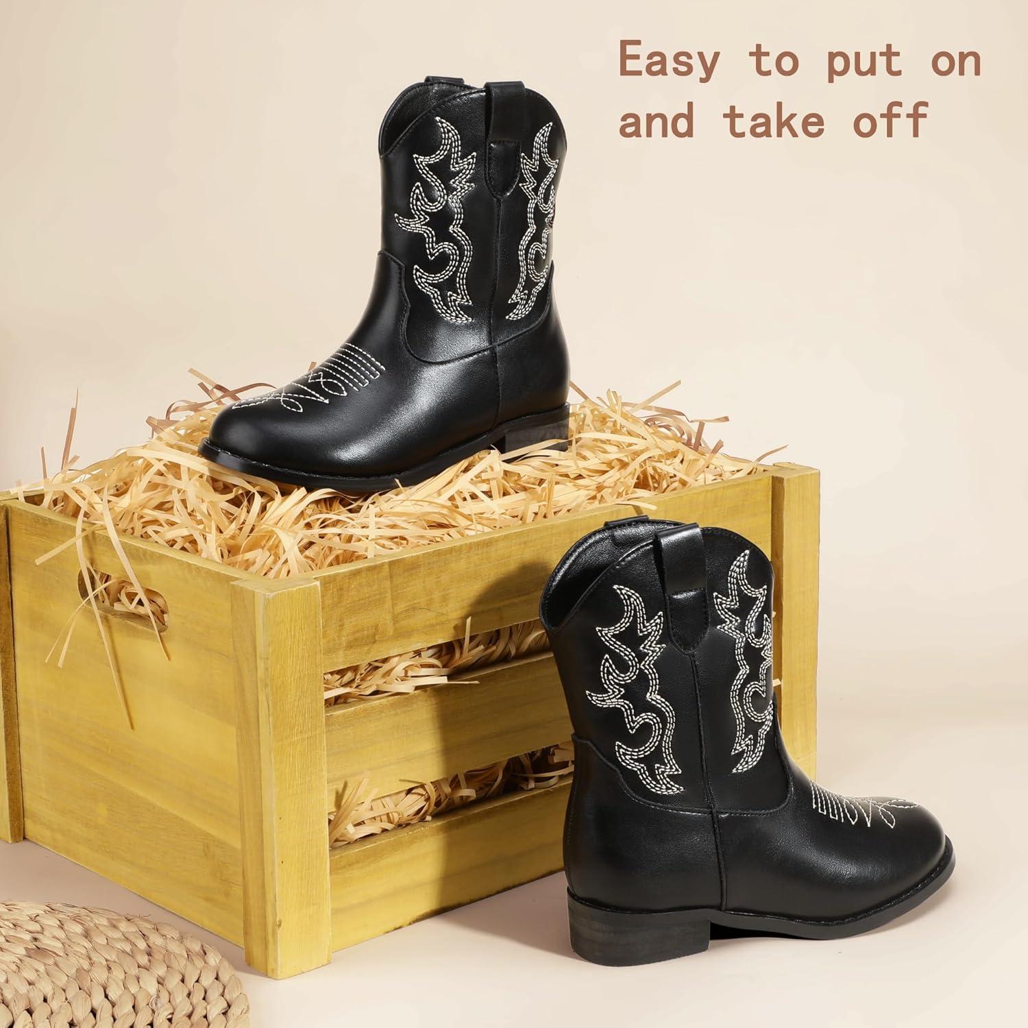 PANDANINJIA Girls Toddler Cowgirl Boots Riding Round Toe Boys Cowboy Boot Little Kids Short Calf Western Cowgirl Booties(Black Pu)