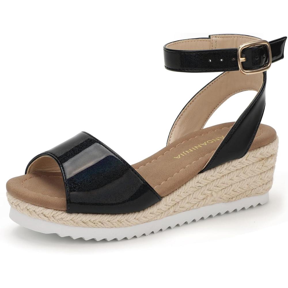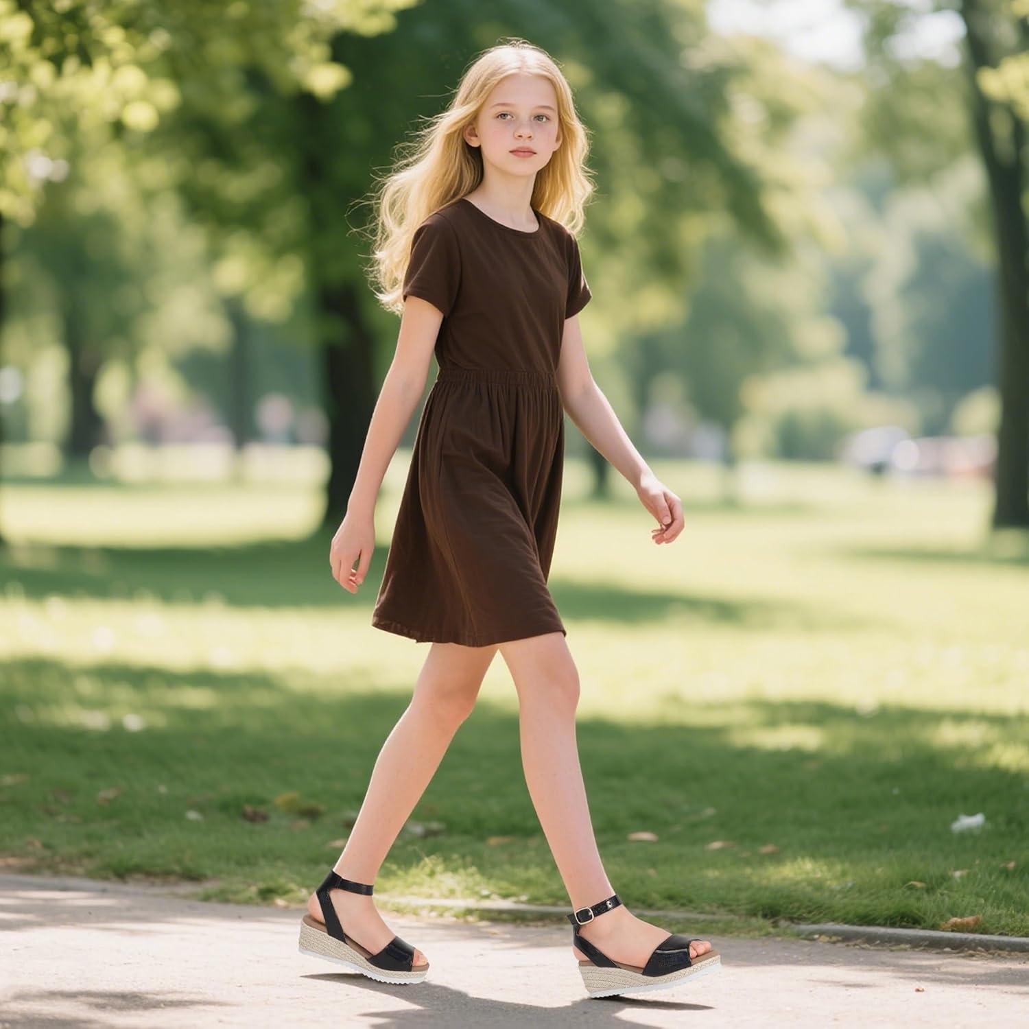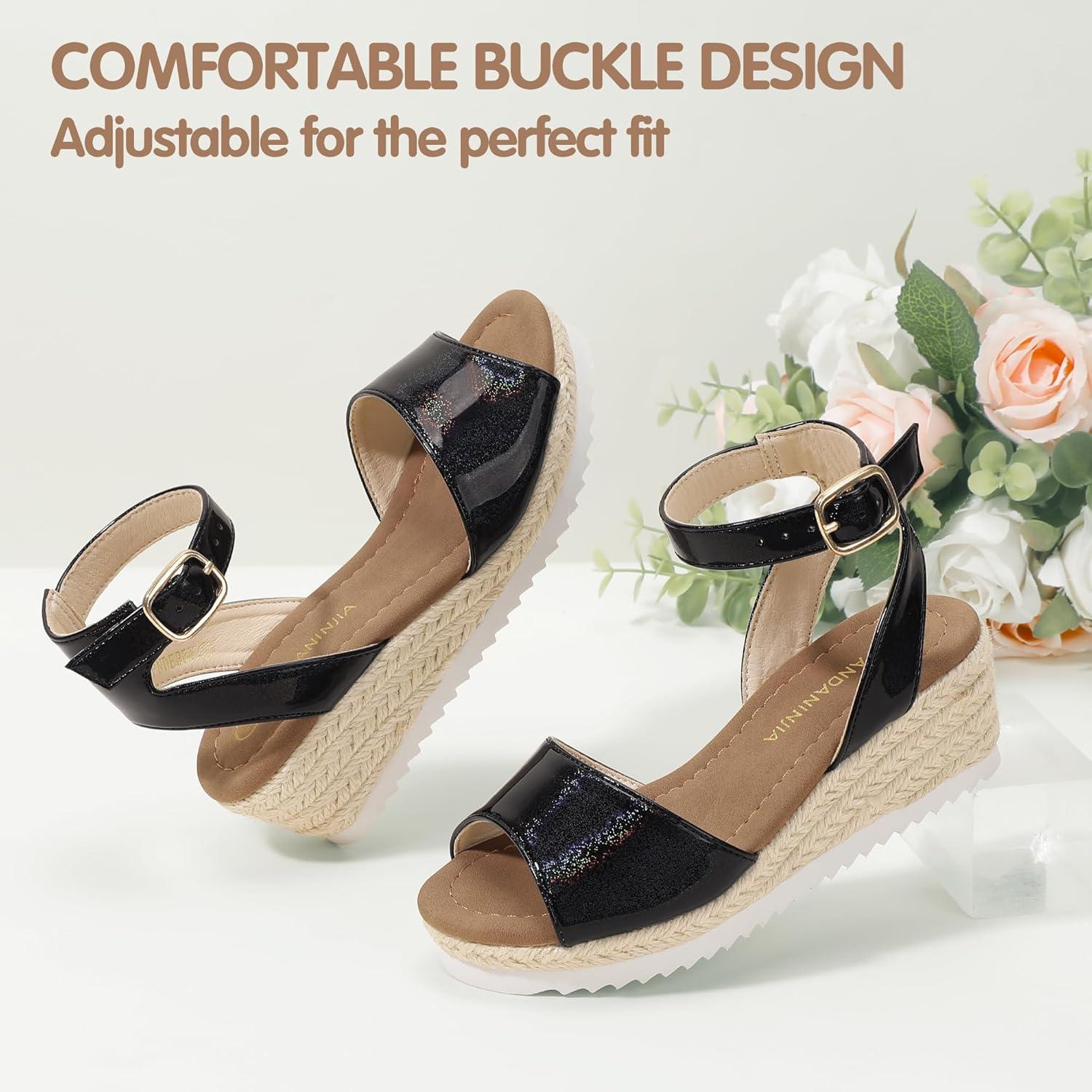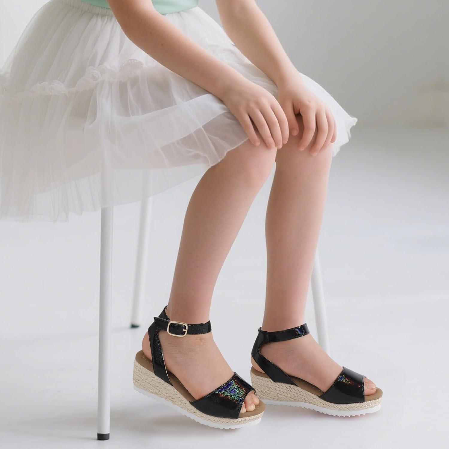 PANDANINJIA Girls Wedge Sandals Espadrilles Platform Heels for Girls Dress Shoes Ankle Strap Little Big Kids Sandals Summer Shoes(Blackbright)